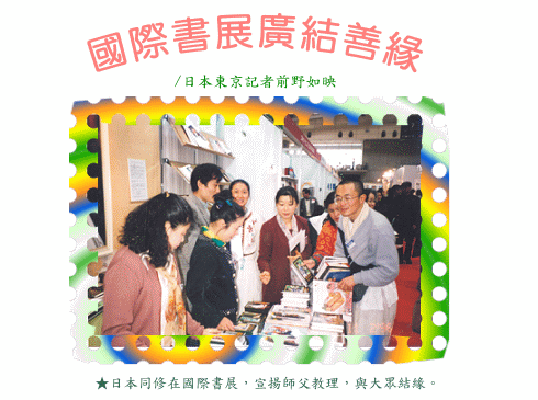 师父的大法相,摆放在摊位的正面,使每一位到场人士,皆可收到她的慈眼加持。一位出版商翻阅经书时,不断赞赏印刷精美、品质优良而爱不释手,一再向同修建议,可在日本大量印刷,让更多人能接触到师父的教理。一位研究宗教的学者,不断向同修询问师父的教理,浏览师父的经书、复制画及录影带后,向同修表示,师父为人类所付出的,远远超越了宗教,不愧为当世明师。