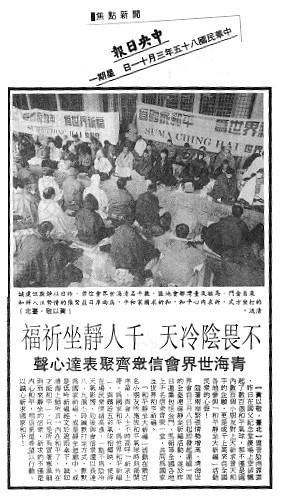 来自金门、马祖及福尔摩沙都会地区,数千名清海世界会信众,昨日以静默但虔诚的打坐方式,祈求内心平和,和祈求国家和平,为两岸日益紧张的情势注入祥和清流。 |