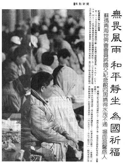 昨(十)日台北的天气阴冷湿雨不断,但是浇不熄清海无上师世界会会员爱好和平与关怀国家的热忱,五、六千名来自全省各地及外岛的大小清海无上师世界会会员,冒着寒风冬雨集结,进行和平静坐为国祈福活动,将国父纪念馆四周回廊的上下,挤得水泄不通,现场宛若朝圣的圣地般,温馨而感人。