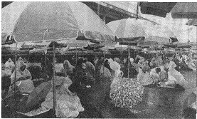 到了下午由于人潮越来越多,只好冒雨在户外草坪上打坐,主办单位为免会员受风寒与饥饿,除了为户外打坐会员调来大批五彩大洋伞外,还准备有姜汤、糖果、水果、素粥、素食便当供应,大多数的同修于用完午餐便当后还回原位继续安静打坐。