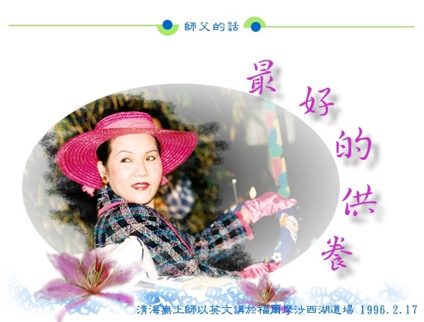就这样,藉由许多才能,上帝透过师父这个肉体工具,将祂的小孩唤回身边。所以没有什么事情是没有用的,我们只要知道如何去使用它们,任何东西都会变得有用处。当我看到有人供养东西给佛陀,然后因此生生世世不断地轮回,并且随身带着一块丝绸或是手中握有两块钱币时,我就觉得非常担忧害怕。所以师父不接受你们的供养,师父宁可你们将自己供养出来,让师父带你们永远脱离苦海,这才是给佛最好的供养。