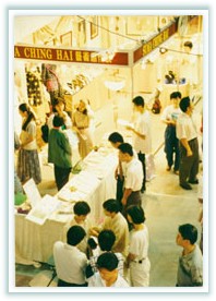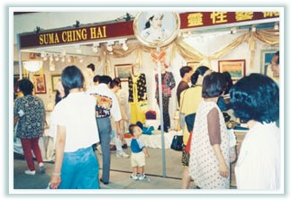 S.M.展览室正位于入口处,几乎每位前来参观的来宾,都能听到师父优雅的歌声与智慧的开示,师父的法相慈视每位有缘众生,吸引不少人驻足观赏。当他们得知师父从未学习设计及绘画,这些作品均来自超世界的灵感时,不由深感钦佩,在展览室里流连忘返,也主动索取样书杂志,想深入了解师父的教理,使得现场的样书和杂志供不应求,更有不少人留下通讯资料,希望长期索阅新闻杂志和报名修方便法。