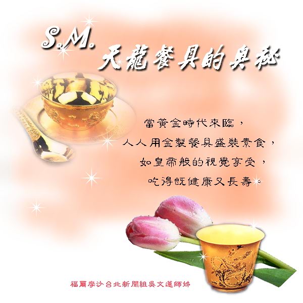当清海无上师所设计的珠宝艺术创作品“S.M.天龙餐组”在福尔摩沙公开陈列时,我曾到场亲眼目睹,黄金制成的餐具金碧辉煌、夺目光彩,强烈震撼我内心,照耀我的灵魂,看一眼,竟回不到凡夫俗子的境界,好像曾经飞奔天上宫阙,披染金粉在身,整天一直轻飘飘,醉陶陶地…。