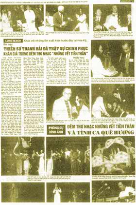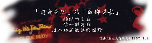 …舞蹈是由清海无上师世界会的成员,专业又年轻的舞者演出,受到观众的赞赏。…最后要赞叹那些工作人员成功地举办了这场最壮观的音乐会,特别是那些年纪轻轻的同修们,尽责任保持会场良好的秩序;结论是海外的艺术表演缺少像这样有价值的艺术之夜。“前身足迹”及“故乡情歌”的丝竹之夜,像一股清泉注入枯萎的艺术田园里。
