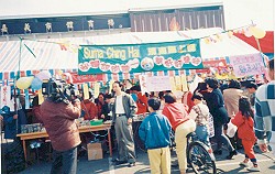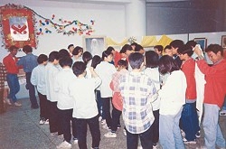 同修们一接到邀请,莫不精神抖擞主动出击,大家协力布置弘法摊位,几位同修更是在凌晨即开始准备精致可口的素食以飨宴来宾。同修节录师父的甘露法语悬挂,许多贵宾一入场即被醒目的内容所吸引,纷纷驻足翻阅师父的著作并欣赏师父高雅的法相、绘画及灯饰。 服务台的同修们为有心询问的贵宾解说师父教理,并将新闻杂志赠送有缘人,现场气氛一片喜洋洋,大家都浸润在师父的大爱中,连本地的“世新”有线电视台也专程派记者来采访录影,为此次“环保有约”的义卖园游会划下完美的句点。 “圣爱”驻进了青年们的“心”
