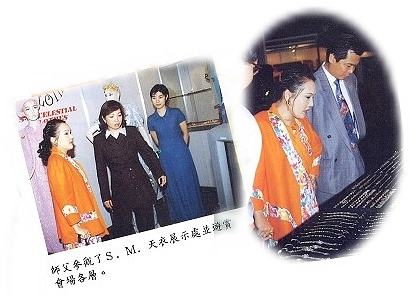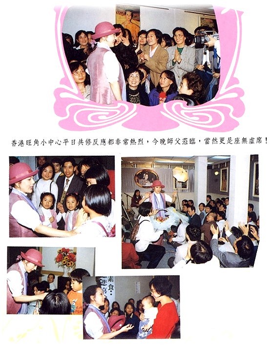 第二天早上,师父抵达展场,参加一年一度秋冬时装开幕盛典。当日师父盛装出席,配搭天饰互相辉映,更显雍容华贵,吸引不少羡慕眼光。席上除来自各地之贵宾外,还有不少商界人士、政府高官,好不热闹。一轮奏乐后,由主办单位负责人致辞,便敦请最后一任港督彭定康先生致开幕辞,致词后主办人随即致送一巨型编织有香港风景特色之地毡作纪念,此时发生一个有趣之小插曲。 通常在这些大型场合,中外记者云集,无不尽施奇技,取得有利位置拍摄重要人物,有一本地记者为抢镜头,一个箭步来到展台举相机拍摄,置其背后之同行不顾,另一女记者禁不住大声地用广东话叫他立即滚开,但他竟充耳不闻,而在场之外国嘉宾不明所以,保安人员不知为什么亦不采取行动,场面显得有点混乱和尴尬。就在此际师父在席上突然开腔,用英文向站在台上之港督说:“港督先生,可否把您手上之纪念品提高一点,以方便在后面之记者拍摄。”港督随着声音望去,看见义勇解围的竟是一位优雅高尚的美丽女士,不期然地把他的手提高,记者们口中连称“谢谢”,跟着闪光灯此起彼落,随即礼成。师父所到之处总是如此自然地排难解纷,使大家都满足愉快! 随后师父在众人护送之下前往S.M.天衣摊位参观,然后再往会展各层游览。是夜,师父在旺角小中心与同修会面。 平时旺角小中心每晚共修反应都非常热烈,那晚更是座无虚席。师父出现时,一连串热烈掌声过后,师徒很快打成一片,从各人面上之喜悦神情,可感到那份无言之兴奋。师父慈悲接见同修外,更与修方便法之朋友共聚一堂,逗弄带来的小朋友。席间很多修方便法者与师父见面后,随即希望能马上印心,师父即时首允。临离去前,师父亲发加持物,人人满载而归。 二十二日晚师父又重临小中心。席间同修祈求师父为他们之女儿命名,师父应允后脱口而出,意思贴切。但师父再三强调,名字对人本身并不重要,父母取的什么名字都是好的,当晚同修皆尽欢。 值得一提是有一修方便法之朋友似乎与师父特别有缘,因为他任职娱乐界,大部分时间为安排各地演唱会,常需飞来飞去(坐飞机)。但那天晚上,师父在小中心会同修,他亦刚抵港,马上赶来与师父见面,才一见到师父,亦感到必须马上印心。他家人听了大悦,欢欣不已。因为他们一家已印心多时,唯独他举棋不定,这刻如此坚定爽快决定,真是妙不可言。 有外地来修方便法人士欲与师父合照,师父亦即首允,这实在是一个愉快难忘的晚上。 第二天师父乘直升机往澳门。在当地联络人带领下,游览澳门小岛,师父初次来澳门,对此地印象不俗。下午二时,师父并受邀抵达S.M.天品店剪彩。