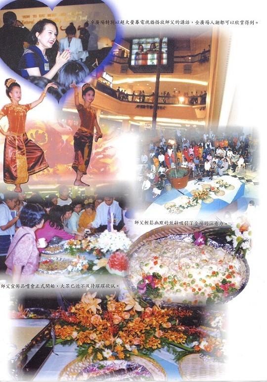 (Central plaza) 看来有点不同,在购物的人潮中,忙碌穿梭着一些面带笑容、衣饰高雅的人们,他们在办喜事吗?“自然、健康、天食”?展示桌上五花八门的食料,工作人员说那全是无蛋、无酒的纯净素食;舞台上灯光、鲜花静候着演出者,广场上方的中庭每层楼都站满了人,好奇等候精彩好戏上演……。