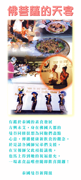 天席似天瀑流泄而下,上百道奇珍,东西方美味兼有,主厨巧夺天工的手艺,雕工、切活处处见到用心,待尝一口,更是滋味绝佳,最特别的是创意新颖。这群可爱的伙头军,称他们为天厨也不为过;拿出绝活,织就一席锦绣,使宾客陶然,犹如置身天宫。可不是吗?还有仙女在旁殷勤招呼呢!何等享受。纯朴的泰国同胞,也尽责的扮演上宾一角,拥护的精神表现无遗,一场天席自始至终都是热场。倒是泰国人的斯文有礼值得一提,热闹不失零乱,一切井井有条,却温暖自然。