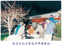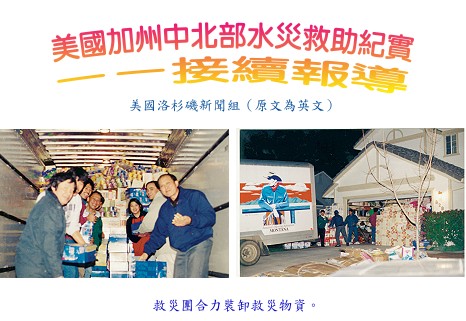 [ 洛杉矶讯 ] 一接获师父指示我们前往帮助北加州水灾灾民之后,洛杉矶的同修立刻准备了一部大卡车及一辆装行李车,装满了数吨的救济品前往萨克拉门多。这些同修是救灾活动的第二组人马,他们从洛杉矶、福尔摩沙、澳洲、南非、智利、爱尔兰、及英国等国来参加加州长堤国际禅五之后,尚未返国,自愿投入救灾工作。 当他们到达时还是清晨,天气十分寒冷,随即加入整理打包救济品的行列,北加州当地的同修彻夜未眠,看到一批生力军前来,更是士气大振。 正在打电话给红十字会的人员搜集水灾和避难所相关的最新消息时,师父也前来爱语鼓励和加持,随即指示大家准备动身。当第一组人马前往灾区之后,其余的人也立刻带着从洛杉矶运来的救济品前往红十字会的仓库,加入他们大规模济助灾民家庭的行列。为了第二天早晨另一次的救济行动,当天还买了数千美元的救济品。迅速打包成数千个礼物袋。 当天晚上我们获悉离萨克拉门多约一小时车程的Yuba City County ,有一个红十字会的避难所急需救济品,我们立刻采取行动。到达当地的清晨,灾民们尚在睡梦之中,避难所的经理表示衷心地感激我们的帮忙和支持。 我们的下一站是离萨克拉门多南部约一小时车程远的严重灾区Modesto 。黎明时开着两部装满赈灾物品的大卡车、数辆小货车及汽车出发,沿着高速公路我们看到了数天前的大水留下了满目疮痍的景象,树上和草地上都沾满泥泞,有一些房屋和建筑仍半淹在水中,居民都迁走,商店全关。与红十字会工作人员沟通之后,我们立刻带着赈灾物品前往在Modesto 、 Red Shield、和Water Ford的四个避难所,将直接发送救济品给水灾灾民,虽然前一天晚上已有许多人离开避难所返回家园,但仍有数百多人留在该处。 救灾团员一一地分送救济品给他们,有些情况特殊的人还给予救济金,师父自掏腰包,送给病人、老人及重灾户等等。他们的反应使我们深受感动。有一位妇女收到救济金后,当我们问她需不需要更多金额时,她很高兴地回答说,她不能贪心。这是个多么令人感动的经验!虽然他们在水灾中失去了许多财物,仍保持诚正高雅的品格,并高兴地收下小额的慰问金,他们皆惊讶于像我们这样的私人慈善机构,在人们需要救济时及时伸出援手。