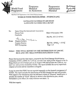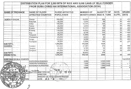 据北韩水灾复建委员会(FDRC)提具报告中说明清海无上师爱心援助北韩两千吨米及五千罐奶粉已如期(1996.8.22) 抵达南婆港(nampo port)。而在北韩粮食部长Mrs. Nam Yong Ae 及世界粮食计划(WFP) 驻平壤代表汉塞先生(Mr. Hausser) 的全力督促之下,已顺利地发放给受灾区居民。两千吨米共计嘉惠北平壤十一个县市及Chagang 三个地区的148,139 人口,五千罐奶粉已发送给Changang三县市的五千位孤儿,每名孩童皆收到一罐奶粉。(明细请见附表A )