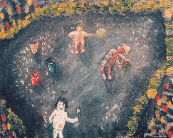“清水池”画中景象是三个人站在干涸的池底,三人之间的距离约相等,他们正在工作。手上拿着工具,身边各有一个小水桶。他们正在做池底的打扫工作,却显得那么畅快,仿如在玩软式棒球游戏。
