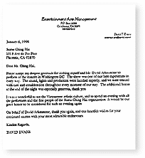 承蒙邀请敝人和David Arkenstone先生在华府举行的音乐晚会演出,请接受我最深的谢意,那场表演无论在任何方面都是我们最美好的体验之一,当晚的音效、灯光和制作都是非常专业的手法,而且我们在每一时刻均受到非常关心和体贴的招待,在晚会结束后所给的额外奖金更是特别大方,谢谢您。