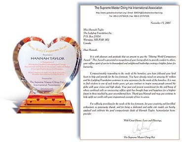 World's Children's Prize for the Rights of the Child)的得奖人一起工作。 清海无上师得知汉娜的博爱精神与善行后,立即颁发“全球优秀爱心奖”给这位慈悲的少女,并赠予加币五千元,以赞助她服务游民的高雅义举。汉娜于黄金5年(2008年)1月接受奖项和礼物后,在寄来的感谢卡中表示:“感谢您的关怀与帮助!您的礼金将使许多饥饿的游民朋友获得帮助!拥抱您,并祝您好运。献上爱,您的朋友汉娜 敬上” 感谢汉娜的爱心与奉献,致力帮助别人拥有温暖舒适的住所并过着有尊严的生活。愿上帝加持你的高雅善行,为其他世人带来爱与慰藉。