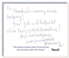 汉娜.泰勒(Hannah Taylor)是一名住在加拿大温尼伯市(Winnipeg)的十二岁女孩,她在五岁时看到一位游民,使她受到极大的震撼,她不断想起那个人,并询问母亲有关游民的事。她的母亲在多次解说后,建议汉娜可以做些事来协助他们,这样可能会让她觉得舒坦一些。隔天汉娜就询问她的一年级老师可否让她和班上同学谈谈游民的事。全班同学听后都深受启发,因此他们决定举办美术作品与烘焙糕饼的义卖,以及衣服捐献活动,藉此为社区的一处游民收容所募款。