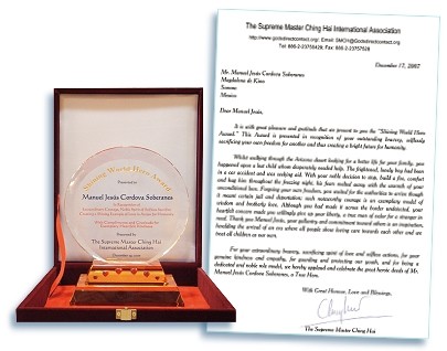 12月29日,清海无上师世界会的会员颁发“全球优秀英雄奖”给科多巴先生。当我们朗读师父的爱心信函时,他的脸上流露出和平与喜悦的光采。他的家人很感谢清海师父赠予这个奖项,也很开心得到一千美元的奖金与数本师父的著作。曼纽尔.赫苏回忆起当晚的情况:“当我看到那个孩子在那里,而且还受了伤、饥寒交迫,我就想到自己的孩子。我只希望有人能来帮助他。” 感谢科多巴先生的慈悲爱心和无私的义举。愿上天的恩典加持他与他的家人,也祝福他拥有满满的上帝之爱,就如同他在寒夜中给予这个小男孩的爱一般。