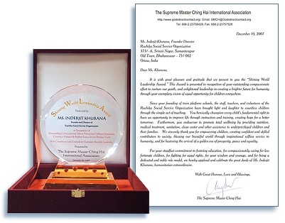 黄金5年(2008年)2月9日,印度奥里萨邦(Orissa)“鲁奇卡社会服务团”(RSSO;Ruchika Social Service Organization)的创办人暨团长英代尔姬.库拉纳女士(Ms. Inderjit Khurana),荣获清海无上师颁赠的“全球优秀领导奖”与5千美元。 库拉纳女士在印度北方奥里萨邦的布巴尼斯瓦尔市(Bhubaneswar)创设了一所小学,并在该校任教。她每天搭火车上班途中,都会看到月台上有许多穷苦的孩童,他们无法享受她的学生所享有的受教机会。她感触万千,于是发心在月台上为贫苦的孩童上课,以这种方式直接与这些穷困却高贵的灵魂接触。 布巴尼斯瓦尔市的火车站月台是她开始播下种子的第一站,她利用唱歌、舞蹈、游戏和其他方法,吸引孩子们来学习。1985年,这些最初播下的种子已萌芽成长,进而发展成“鲁奇卡社会服务团”。由于RSSO的努力,目前印度已有一百多所月台学校,帮助四千多个孩童学习。这些小朋友不仅学习读书、写字和算术,也获得他们最迫切需要的医疗和营养方面的照顾。 库拉纳女士对于获颁“全球优秀领导奖”感到既高兴又荣幸,也很惊讶她的小团体竟能获得清海无上师这般开悟明师的眷顾。她表示,能获得民众的关怀与支持,令她十分感动,也使她得以继续从事这项高雅的上帝工作。她还补充说:“如果我不尽一己之力去服务别人,在这个世界上还能做什么呢?”库拉纳女士是一位名副其实的英雄,她奉献心力,致力帮助弱势孩童,为我们树立了优秀的典范。