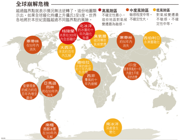 美国新闻组报导(原文为英文) 地球的环境就像是精心编织的斗篷,但自从十八世纪初期以来,人类毫不节制地使用石化燃料、滥砍森林和工业化等活动,再再产生大量的温室气体滞留在大气层中,因而破坏了大自然精细的平衡。 一群顶尖的英国气象科学家最近发表的一份研究报告指出,一些地区的气候变化正逐步逼近再也难以挽回的“转折点”,或是当气温上升超过某个临界点时,对地球的气候、环境与居民,将会造成无法挽回的连锁效应。 指导这项研究的东英格兰大学(University of East Anglia)教授提姆.兰登(Tim Lenton)表示:“最大的威胁是北极海冰层与格陵兰冰原达到融化的临界点,另外还有至少五项生态变化的临界点也将接踵而至,这些情况可能会使人们大为震惊。” 兰登博士提到的临界点,是指气温上升摄氏0.5至2度时,将导致格陵兰冰原与北极海冰层的融化,这不仅会促使海平面上升,也会使这些地区不再反射阳光的热辐射,因而造成大气层温度不断上升,并进一步扩大冰层的融化,引发一连串的天灾,如水灾、干旱、海底冒出大量毒气、多种动植物绝种的巨大损失等。全球暖化也将产生连锁效应,例如印度洋季风系统的崩溃,亚马逊雨林与极北地区寒带林的消逝等。当地球的气温上升超过摄氏5度时,更多的冰层将融化,海平面显著上升,犹如脱缰之马,而无法预期的气候型态将达到足以酿成巨祸的程度,这些巨变不但会造成物种灭绝,也将危及人类的生存。 根据兰登教授的研究报告,以下的地图说明了遭受危害的地区以及冰层与冰原融化的速度∶