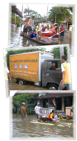 2007年12月31日,泗水和玛琅小中心的同修前往博佐内格罗县(Bojonegoro),该县有十六个行政区(超过全县的百分之五十)都被洪水淹没,其中有三区甚至淹水达三公尺深。救援队将饮用水、饼干和拖鞋等救援物资,交给当地的红十字会,以便发放给散居四处的灾民。一星期后,救援队又前往受创严重的圣提尼村(Centini)发放救援物资。村长表示,该村整个被洪水淹没,水深达两公尺,大部分农田都被摧毁殆尽。因此毛毯和饮用水等救援物资皆深受居民喜爱。 2008年元月4日早晨,日惹小中心的同修启程前往古杜斯镇(Kudus),当地有18,751位灾民。随后在当地红十字会会员的陪同下,同修们来到杰提斯卡普汉村(Jetis Kapuhan),此地有一百多公顷农田被洪水淹没。在发放了46袋米和432瓶饮用水给村民后,救援队又提供一些救援物资给红十字会的营地,因为那里的工作团队已经发完所有物资。 村民们表达了对师父最深的感激之意,感谢师父提供救援物资给他们。由于上帝的恩典,洪水于元月8日消退,让许多灾民得以重返家园。