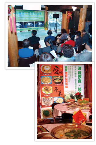 2月2日,台北与新竹同修在台北县新店市花园新城的年货街联合举办素食推广活动,呼吁民众多蔬食、少肉食,以改变饮食的方式降低畜牧业为地球造成的破坏。2月13日至18日在第16届台北国际书展期间,同修们发出7万多份文宣品。2月15日是中国传统节日“元宵节”的点灯日,同修们持续在国父纪念馆及市政府广场的花灯展附近周边道路发送文宣,有的同修还装扮成小丑,提着印有“吃素救地球”的灯笼,引来民众的注目。