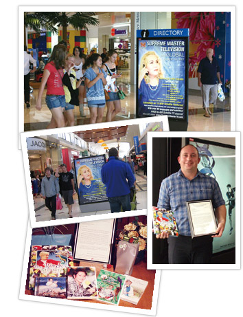【奥克兰讯】黄金5年(2008年)2月18日,奥克兰小中心的同修致赠礼物、感谢函及师父的出版品给“EYE Shop”的会计经理卫斯理.佩帝先生(Wesley Peddie),以感谢他对“无上师电视台”全球卫星开播的大力支持。佩帝先生免费为我们在纽西兰23个主要购物中心的灯箱和旋转展示架刊登广告,并额外提供数位电子看板,以达到更佳的宣传效果。