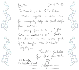 师父数度称赞灾民的耐心和谦卑。他们排着整齐的队伍,安静的接受救灾品,并不忘道谢。有一位男士一直向师父鞠躬,称呼她为“陛下”,还问师父是否为亚洲某国的总统。师父边笑边否认,但这位男士却很确定师父是一位伟大而高雅的众生。他有礼地请求师父给他一个拥抱,师父也欣然慈允。