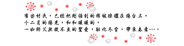 在注滋口的注南村,有些村民已经把刚领到的棉被晾晒在阳台上;十二月的阳光,和和暖暖的,一如师父无微不至的圣爱,融化冬雪,带来春意…;菜民村的村民刚领到大白米,脸上可以见到快乐的笑靥,在沿河沟南向的东堤,道路被洪水冲毁、房屋倒塌,低处的稻田成泥湖、荷池成了死潭;村民们正默默地重建着二层高的砖房。