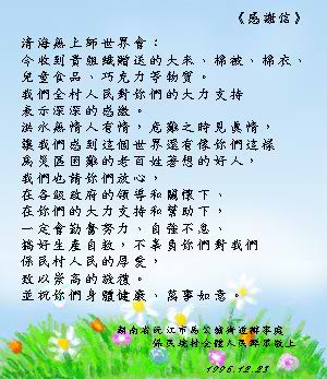 其他工作团的成员,也分别在二十三、二十四日两天各自抵达南咀镇、马公铺、白沙乡、共华、三眼塘、泗湖乡,进行发放的工作;其中一些村民非常高兴物资顺利分发到灾民手中;马公铺的地方政府,还特别写了一封感谢信,表达他们的谢意(见附件一)
