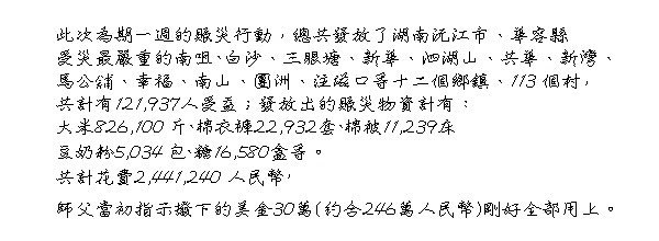 华容县政府的民政局一直说要办个答谢典礼感谢我们团体,地方上的电视台也拍摄了一些工作团人员在赈灾发放时的情景。其实最该感恩的是我们千处祈求千处应的师父,是她听到了饥寒灾民的渴求,我们才有机会能做一点我们该做的事。我们回谢他们的好意,只希望他们能全力配合,在最短的时间内,把赈灾物资如如实实地交送到每一位需要的灾民手上,这才是师父的本意,而他们也的确尽力与我们相搭配;二十一、二十二日两天发送完毕,二十二日的半夜,我们便赶往赈灾的下一站--沅江市。